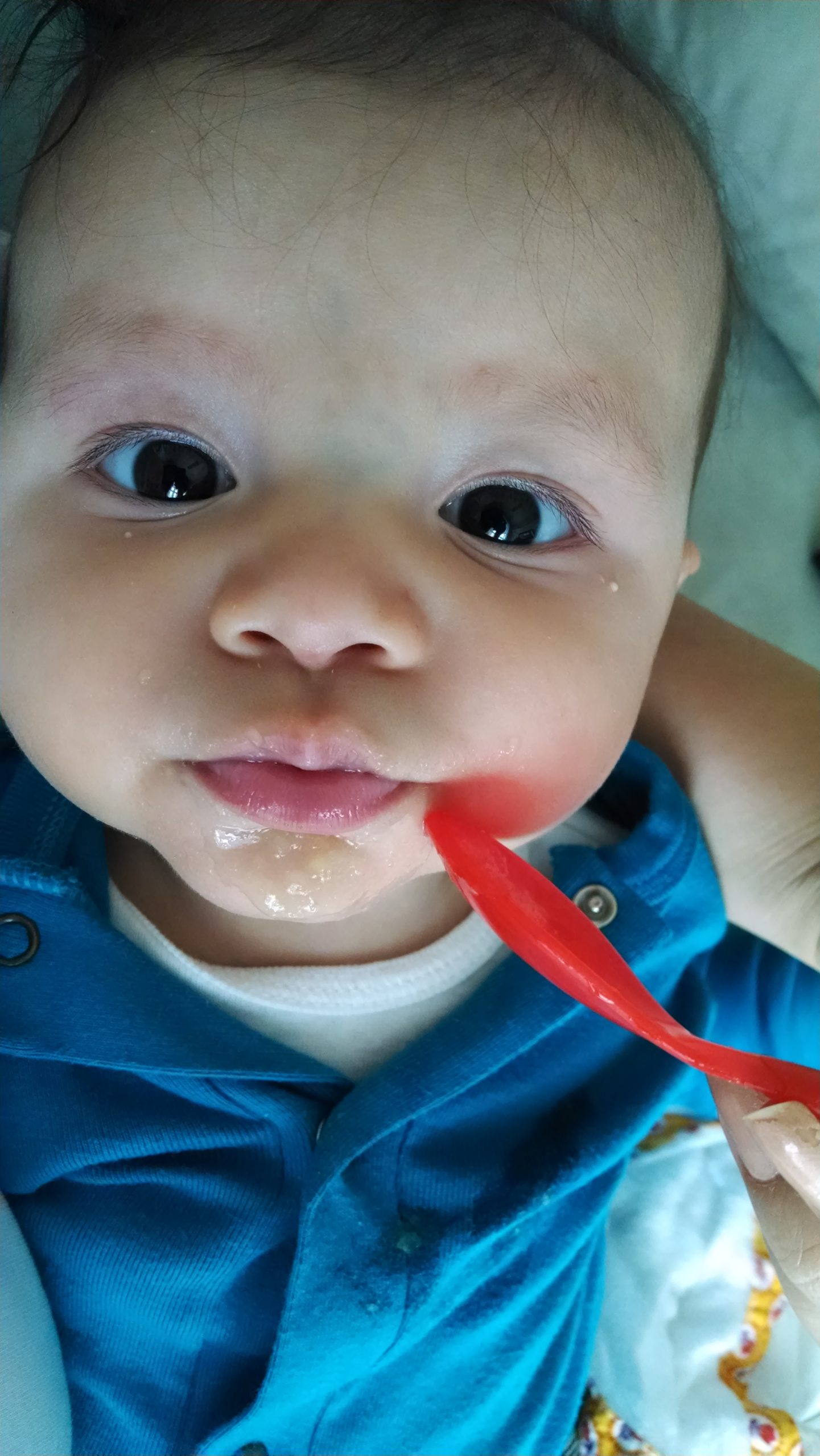 Também está na fase de “quase” engatinhar. Fica deitadinha de bruços, roda de um lado pra outro e anda pra tráz.