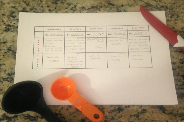 Sexta feira tiro uma meia horinha da minha tarde para montar o cardápio. Aproveito esse momento para ver tudo o que tenho na dispensa e na geladeira para melhor aproveitar os alimentos e evitar desperdícios.