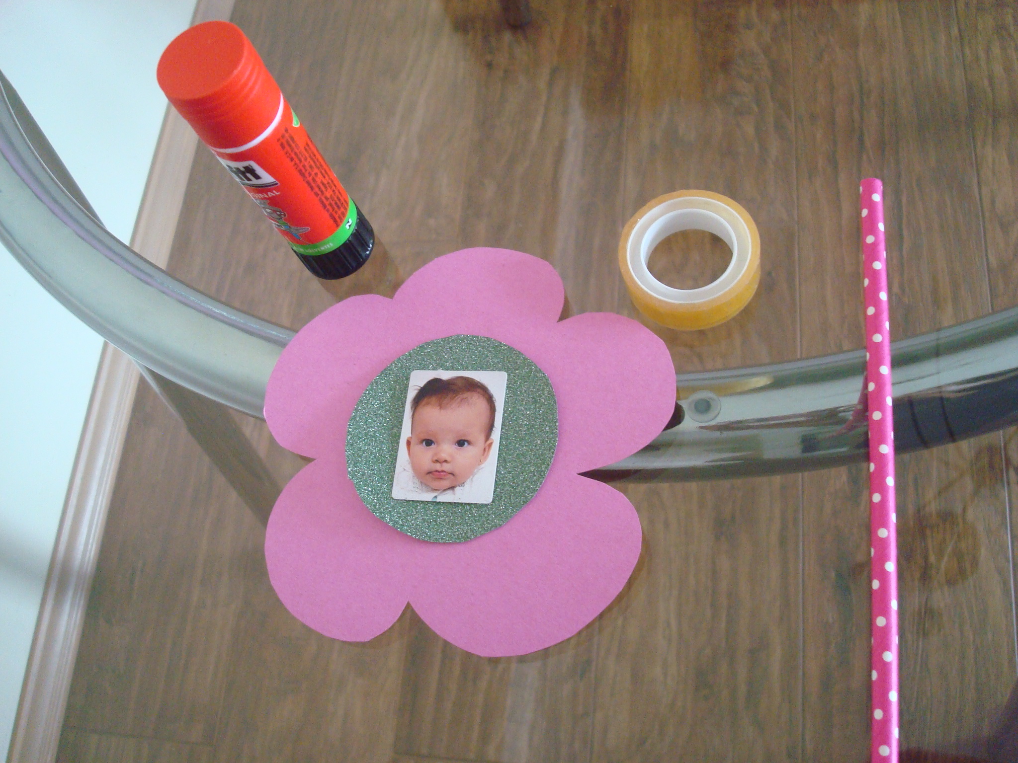 4. Terceiro Passo: colar o miolo na flor, as duas faces da flor entre si com o canudo no meio, usando a cola; colar a foto do seu bebê no centro, com durex (adere melhor).