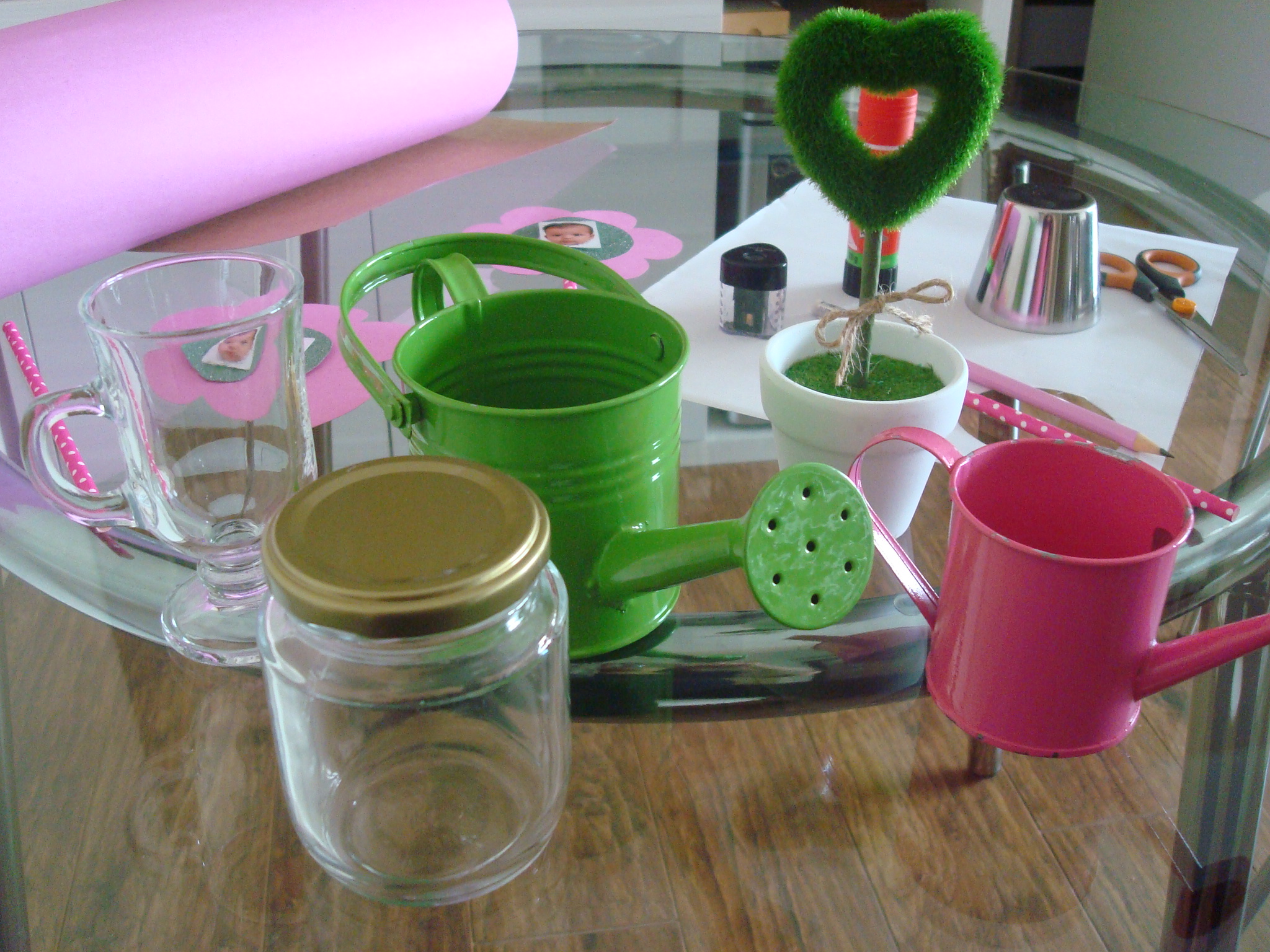 1. Material usado: papel cartão cor de rosa, papel de presente verde com brilhos, tesoura, cola, durex, lápis, canudo de papel enfeitado, suporte de vasinho e foto. Comprei o material em uma papelaria perto de casa, com exceção do suporte e do canudo e comprei em uma loja de produtos de festa.