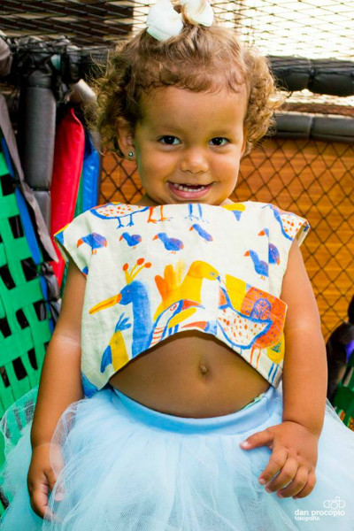 Para combinar com a saia comprei em uma loja muito fofa, a Fábula, uma blusinha curtinha estilo cropped em tons claros de beje, azul, amarelo e laranja, que na minha opinião ficou um verdadeiro charme. Sandalhinha nude no pé e um belo laçarote na cabeça. Pronto, look completo!!!