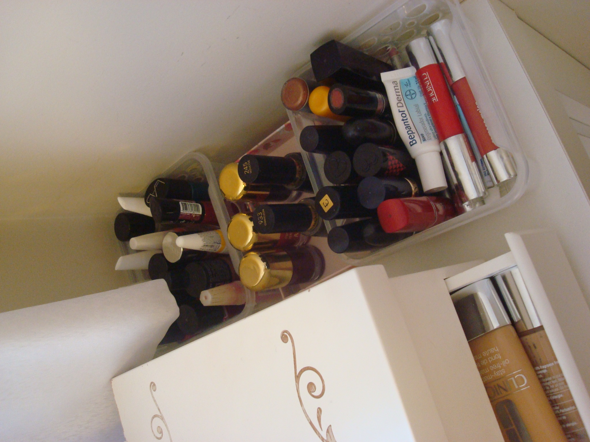 No cantinho mais escondidinho do espaço deixo umas Caixinhas Organizadoras de plástico com os meus Batons e Esmaltes. Fica tudo organizadinho, mas menos visível pois não acho esses itens muito bonitinhos para chamar atenção.