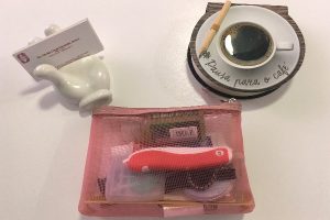 - E não aparece na foto, mas geralmente deixo também 1 absorvente e lenço de papel.